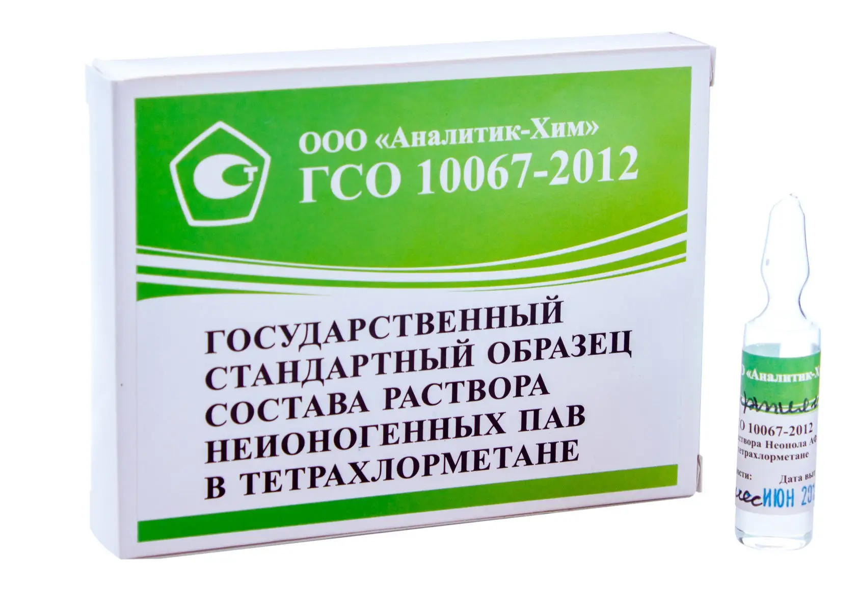 Материал СО представляет собой раствор неионогенного ПАВ (Неонола АФ 9-12) в тетрахлорметане. Стандартные образцы поставляются в стеклянных ампулах вместимостью 5 см3, объём материала СО в ампуле 2 см3.