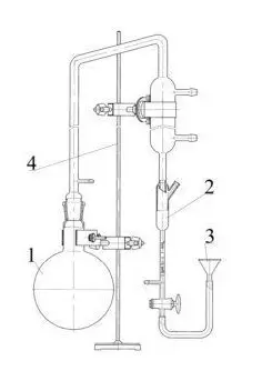 Прибор состоит из испарительной колбы вместимостью 1000 мл поз. 1, системы охлаждения поз. 2, воронки лабораторной В-36-50 поз. 3, штатива поз.4.