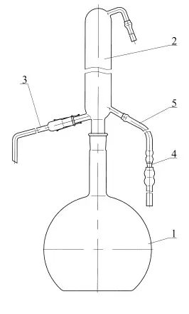 Состоит из испарительной плоскодонной колбы поз.1, холодильника шестишарового поз.2, отвода конденсата поз. 3, резиновых трубок поз.5 и переходника поз.4 для их соединения.