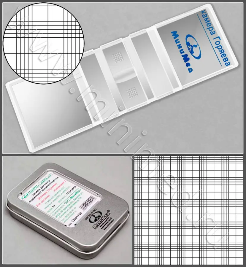 Камера для счета форменных элементов крови (Камера Горяева) 2-х сеточная предназначена для подсчета форменных элементов крови и иных частиц сходных размеров. Изготовлена из оптического стекла марки К-8. Традиционный инструмент, изготовленный на превосходном уровне новейших технологий, существенно облегчает процесс подсчета частиц. Высококонтрастная сетка камеры нанесена методом вакуумного напыления с точностью микропроцессорных элементов. В комплект входят 5 специально полированных покровных стёкол, обеспечивающих заданную точность объема камеры.