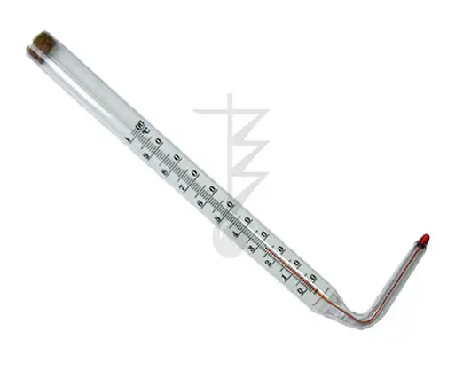 Стеклянный жидкостный термометр с вложенной внутрь оболочки шкальной пластиной. Термометр неполного погружения. При измерении температуры глубина погружения равна нижней части термометра. Термометры ТТЖ У - с углом нижней части 90 °С.