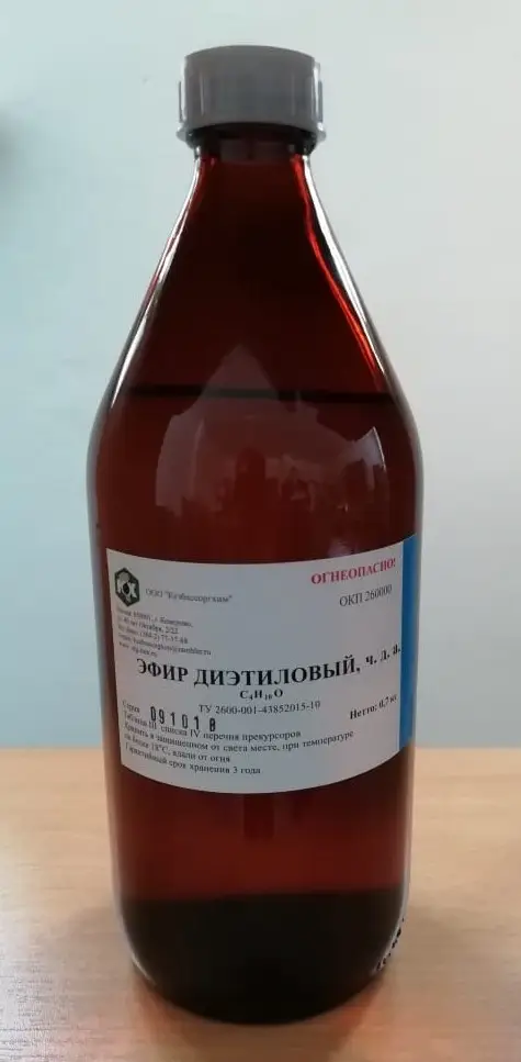 Диэтиловый эфир ЧДА (этоксиэтан, серный эфир) - это реактив, производимый в строгом соответствии с ТУ 2600-001-43852015-10. Купить диэтиловый эфир ЧДА, соответствующий строгим нормам для лабораторных и аналитических работ, можно в нашем интернет-магазине. Реактив поставляется в герметичной стеклянной бутылке 1 л, что гарантирует его сохранность и защиту от образования опасных примесей.